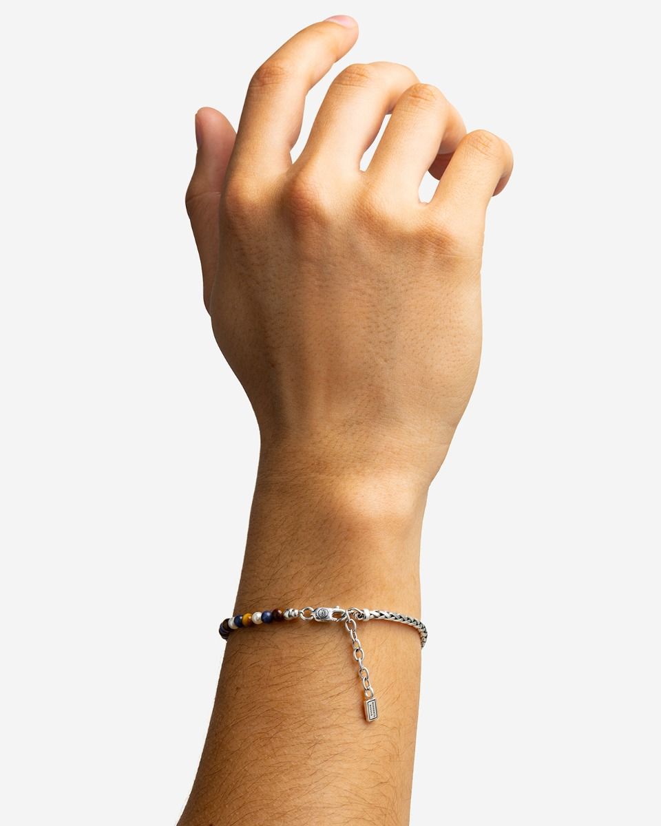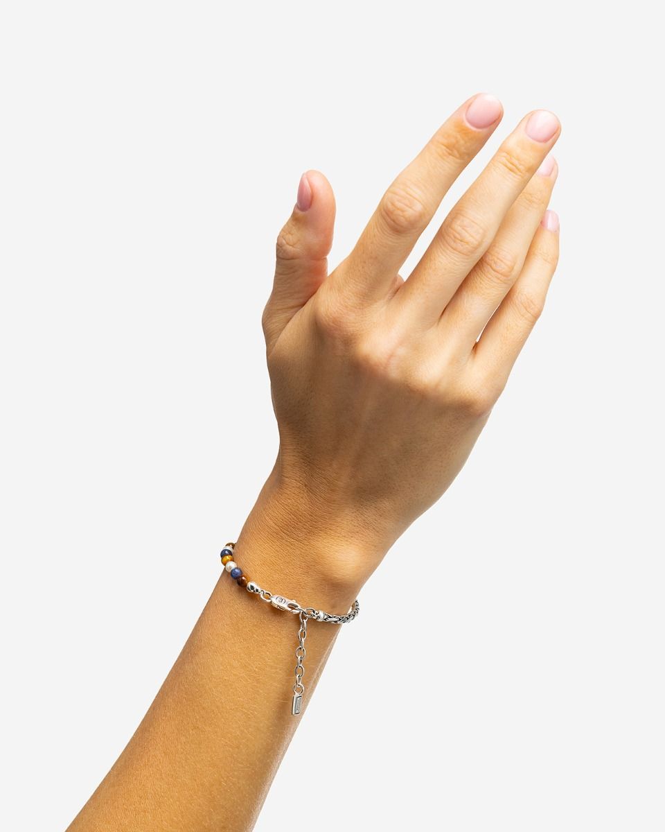 De Spirit Bead Stacking Armband van Buddha to Buddha is een krachtig en stijlvol sieraad dat natuurlijke edelstenen combineert met luxe zilver. Deze uitvoering bestaat uit tijgeroog (bruin/goud) en sodaliet (blauw), twee stenen die symbool staan voor kracht, focus en innerlijke rust. Het geheel is afgewerkt met een 925 sterling zilveren element, met de hand vervaardigd en voorzien van de kenmerkende Buddha to Buddha-signatuur.