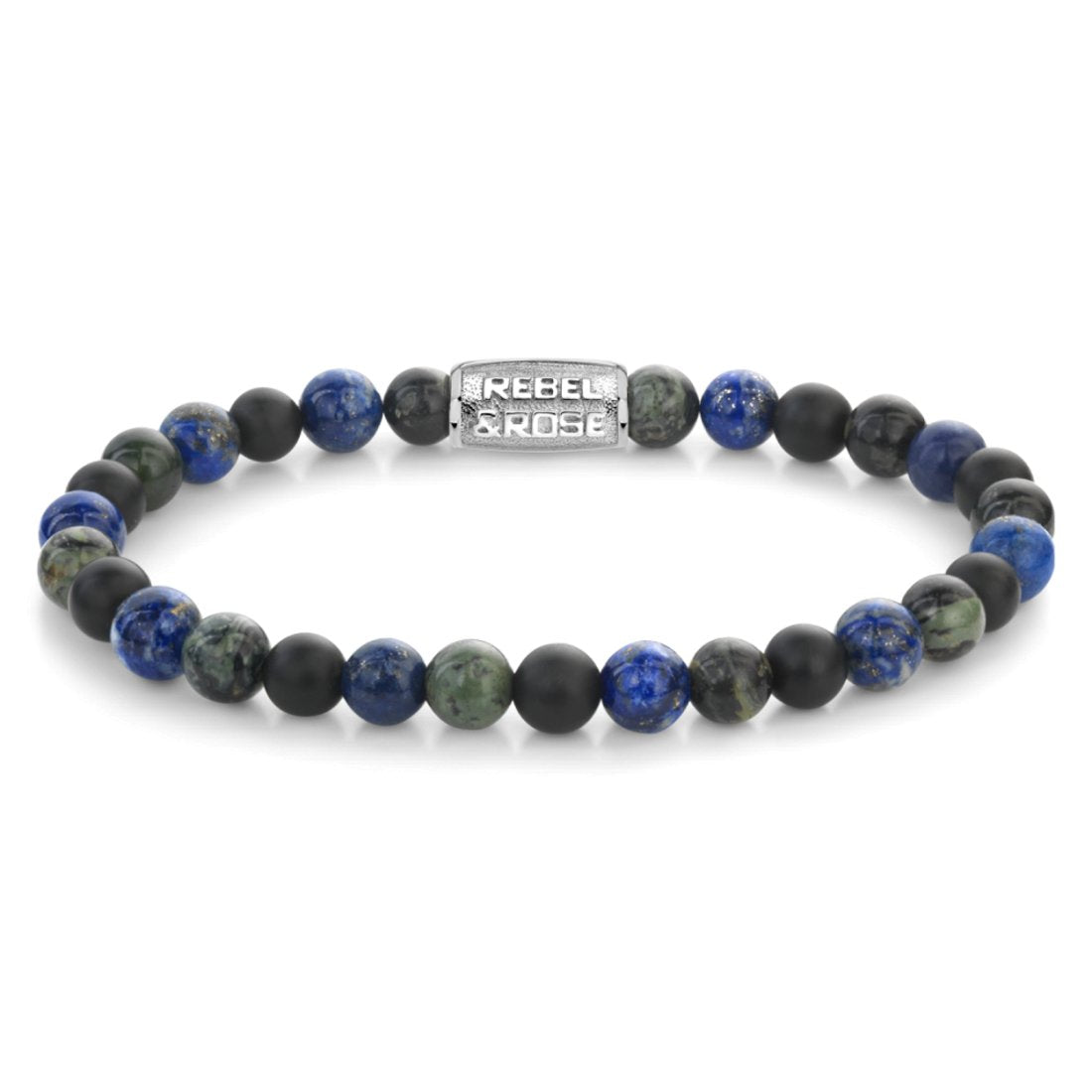 Trendy en stoere Rebel & Rose armband voor dames en heren in het blauw met zwart en groen uit de serie Stones Only. De RR-60141-S-L Rebel en Rose armband is gemaakt van 6 mm Lapis Lazuli, Ryoliet en Onyx stenen. De armband heeft als eyecatcher het edelstalen Rebel & Rose logo. De lengte van de armband is 19 cm. Alle Rebel and Rose bracelets worden gemaakt van de beste materialen. Een Rebel & Rose armband is een stoere armband voor dames en heren en perfect te combineren met andere juwelen en diverse outfits.