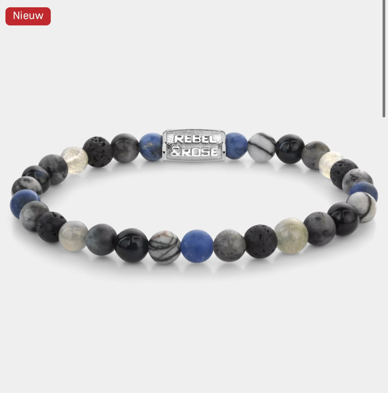 Bead armband, handgemaakt van 6mm Sodaliet Blauw, Agaat (Black Network), Tijgeroog Blauw, Larvakiet Grijs, Labradoriet en Lava stenen met een zilverkleurige sluiting. De Rebel & Rose sieraden zijn makkelijk te combineren met andere zilveren, leren of kralenarmbanden.