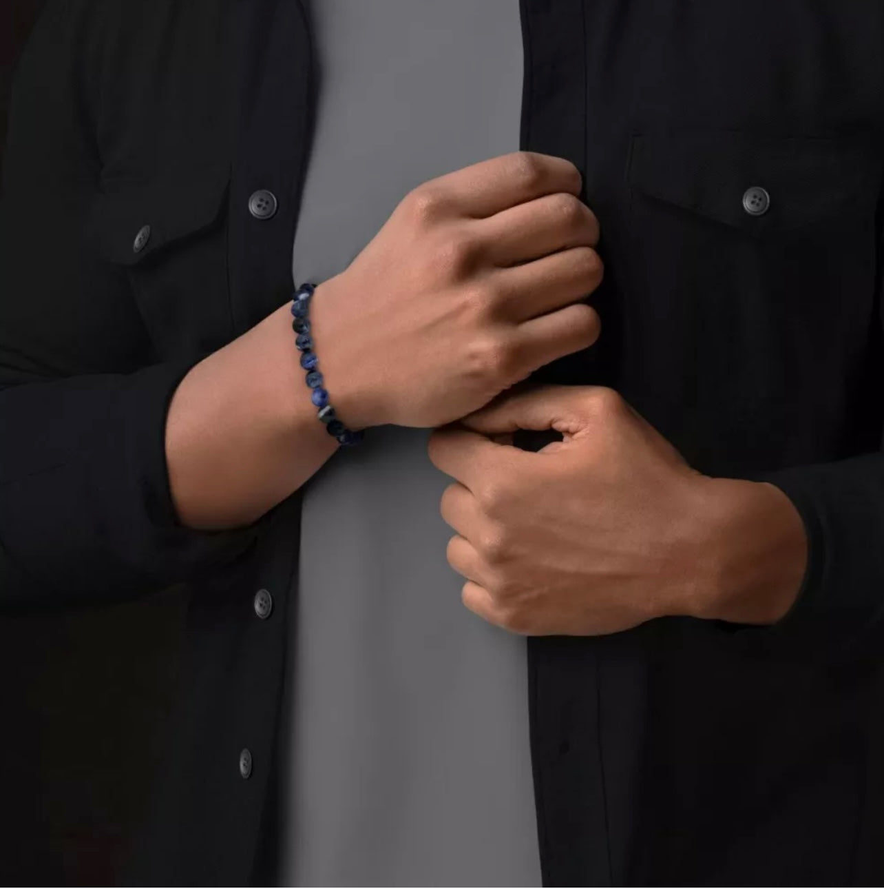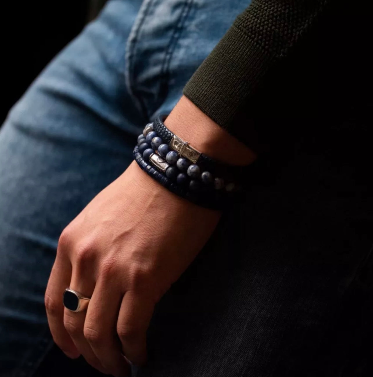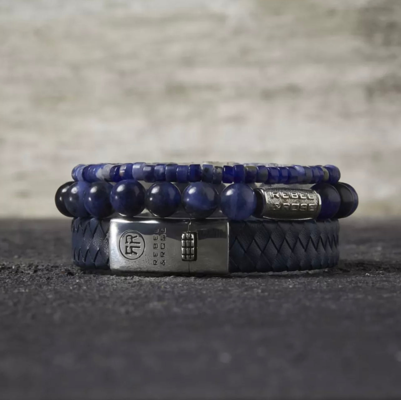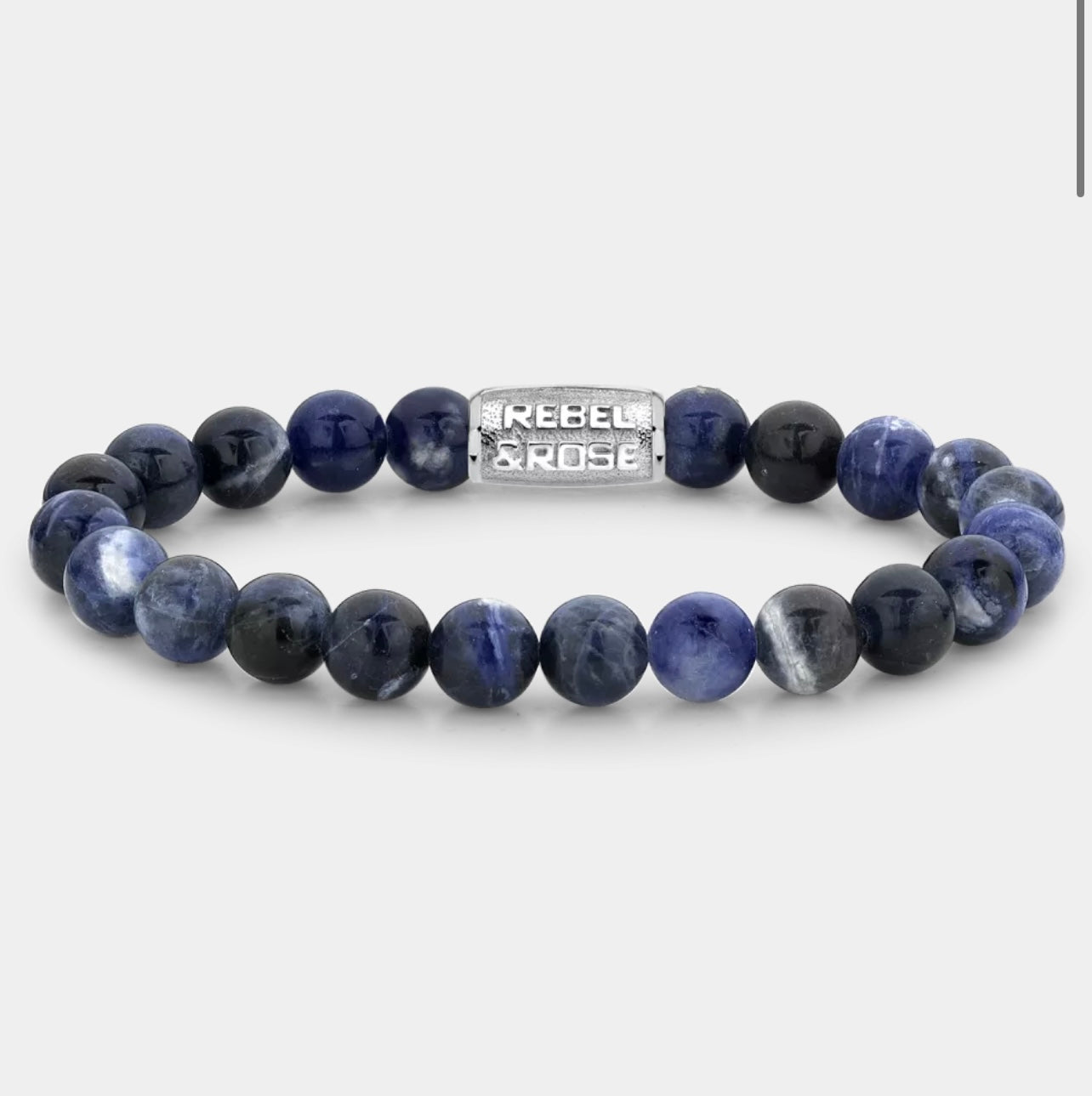 Edelstenen bead armband, handgemaakt van 8mm blauwe Sodaliet stenen met een zilverkleurige sluiting. Het Rebel & Rose sieraad is makkelijk te combineren met andere zilveren, leren of kralenarmbanden.