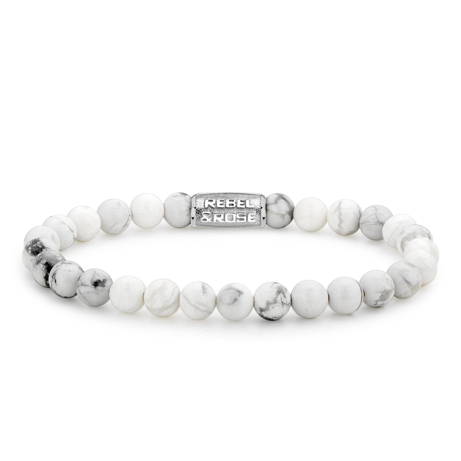 Edelstenen bead armband, handgemaakt van 6mm witte Howliet stenen met een zilverkleurige sluiting. Het Rebel & Rose sieraad is makkelijk te combineren met andere zilveren, leren of kralenarmbanden.