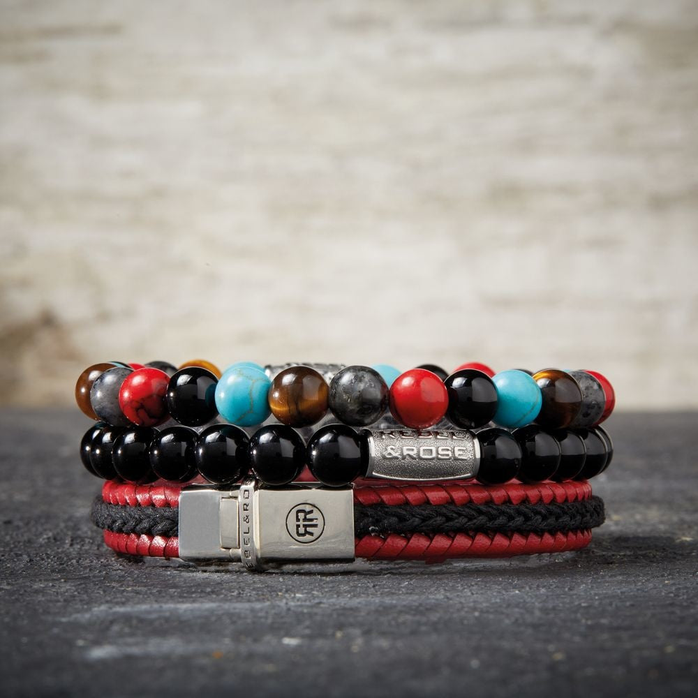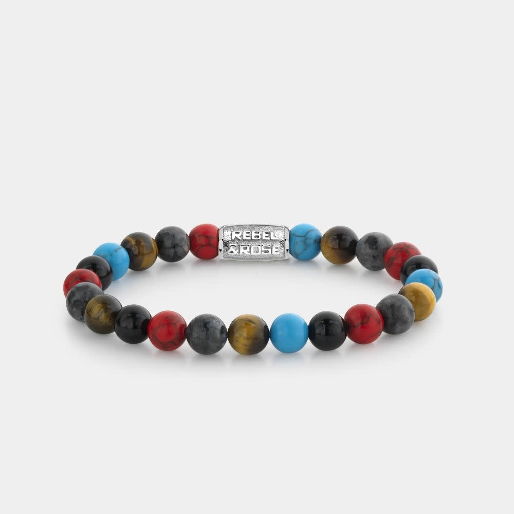 Bead armband, handgemaakt van 8mm Turquoise, Yellow Tiger Eye, Larvikite Grey, Artificial Turquoise Red en Onyx Black stenen met een zilverkleurige sluiting. Het Rebel & Rose sieraad is makkelijk te combineren met andere zilveren, leren of kralenarmbanden.